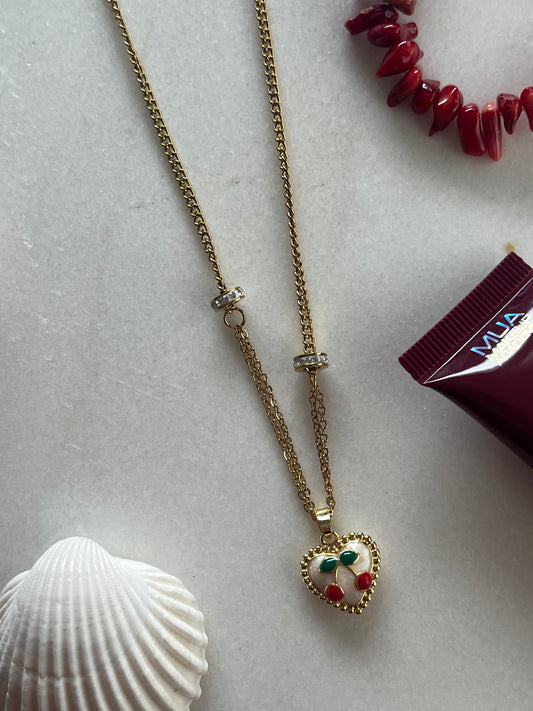 Κολιέ Ατσάλινο Αλυσίδα σε Σχήμα Καρδιάς με Κερασάκι Vintage 'Good Luck'