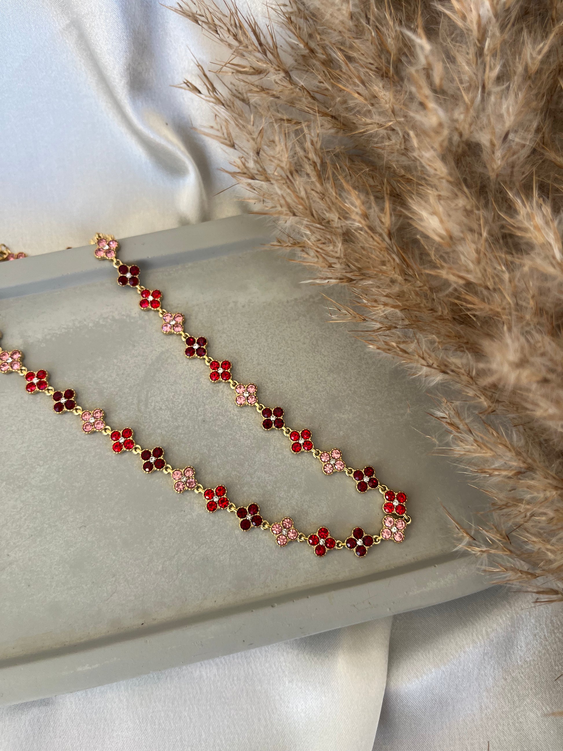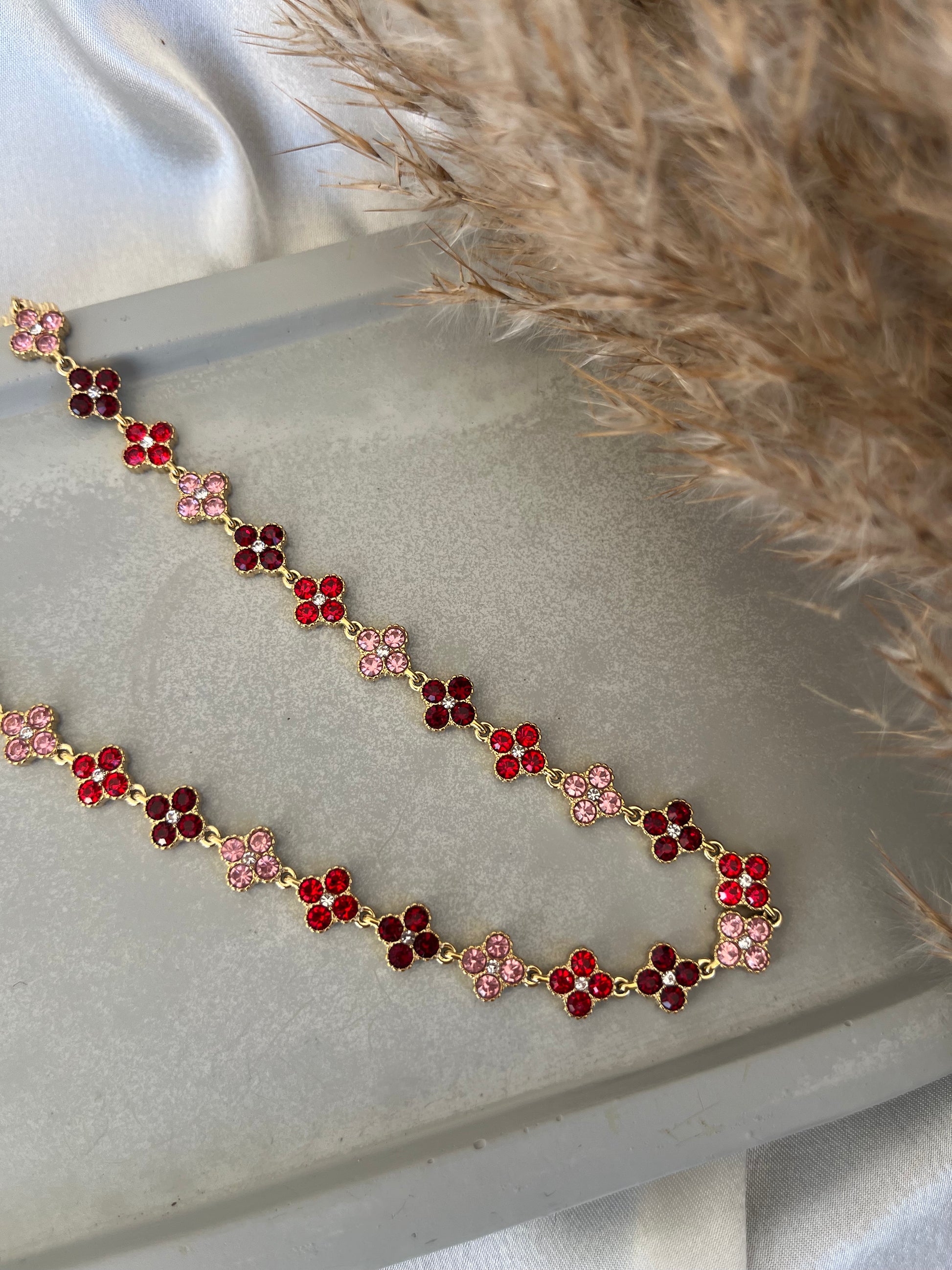 Γυναικείο κολιέ ριβιέρα με ζιργκόν και σχέδιο τριφύλλι από ανοξείδωτο ατσάλι για να μην μαυρίζει.Σε αποχρώσεις καφέ-ροζ-κόκκινο, η συγκεκριμένη ριβιέρα θα αποθεώσει τα λουκ σου.