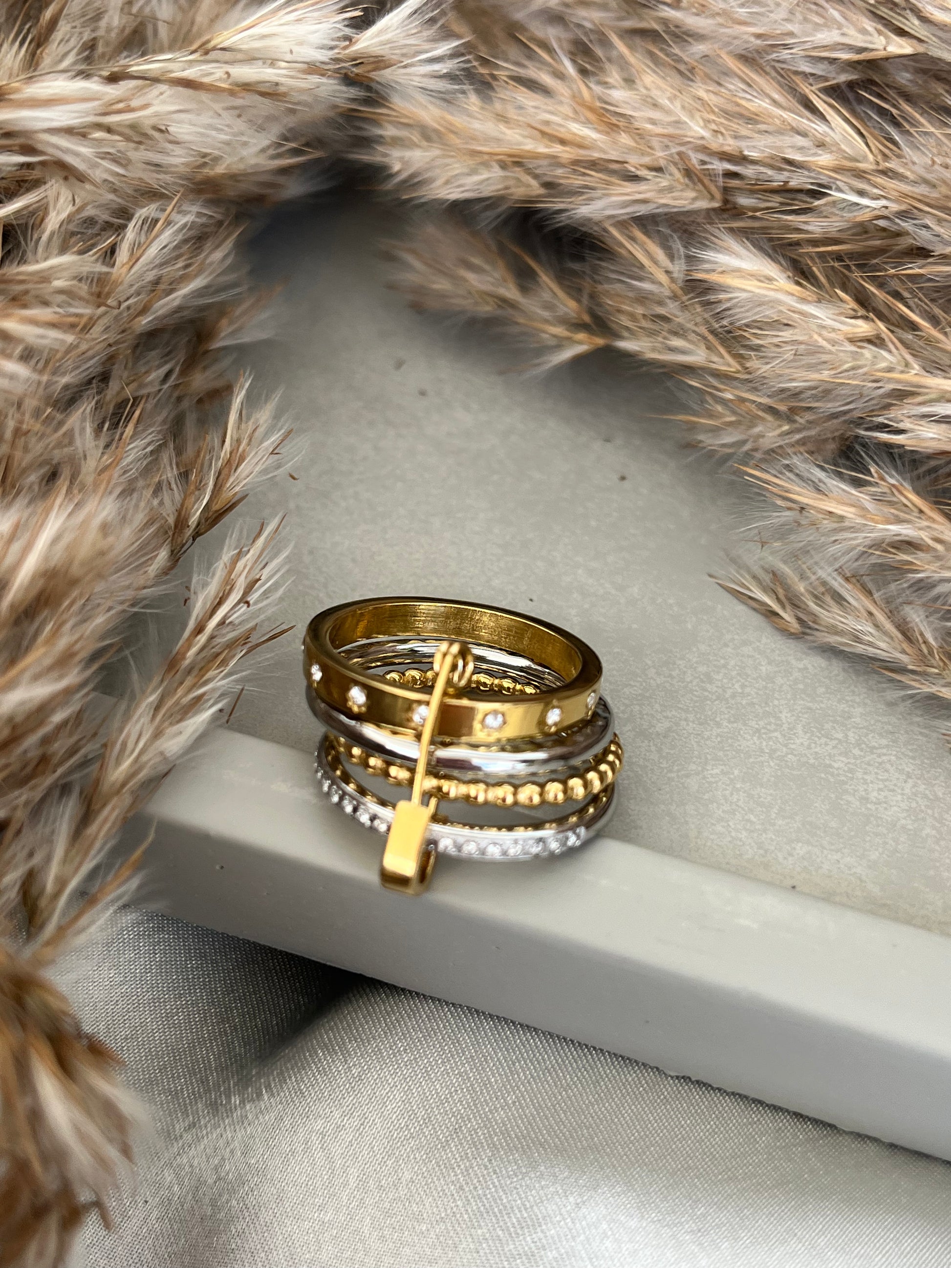 Γυναικείο δαχτυλίδι με πολλαπλά στρώματα και διχρωμία με μοτίβο και ζιργκόν που ενώνονται με παραμάνα από ανοξείδωτο ατσάλι.Διατίθεται σε ένα μέγεθος!