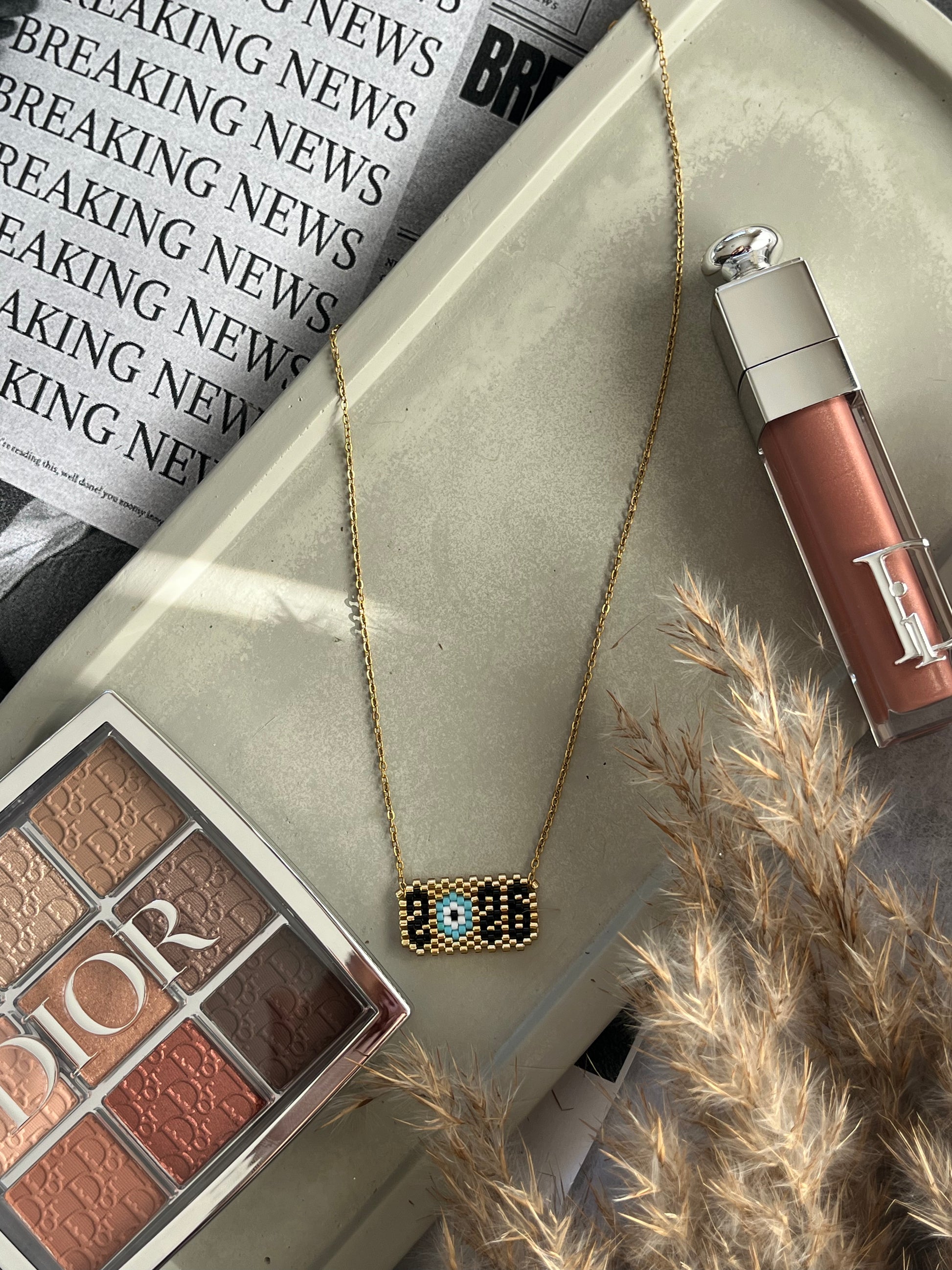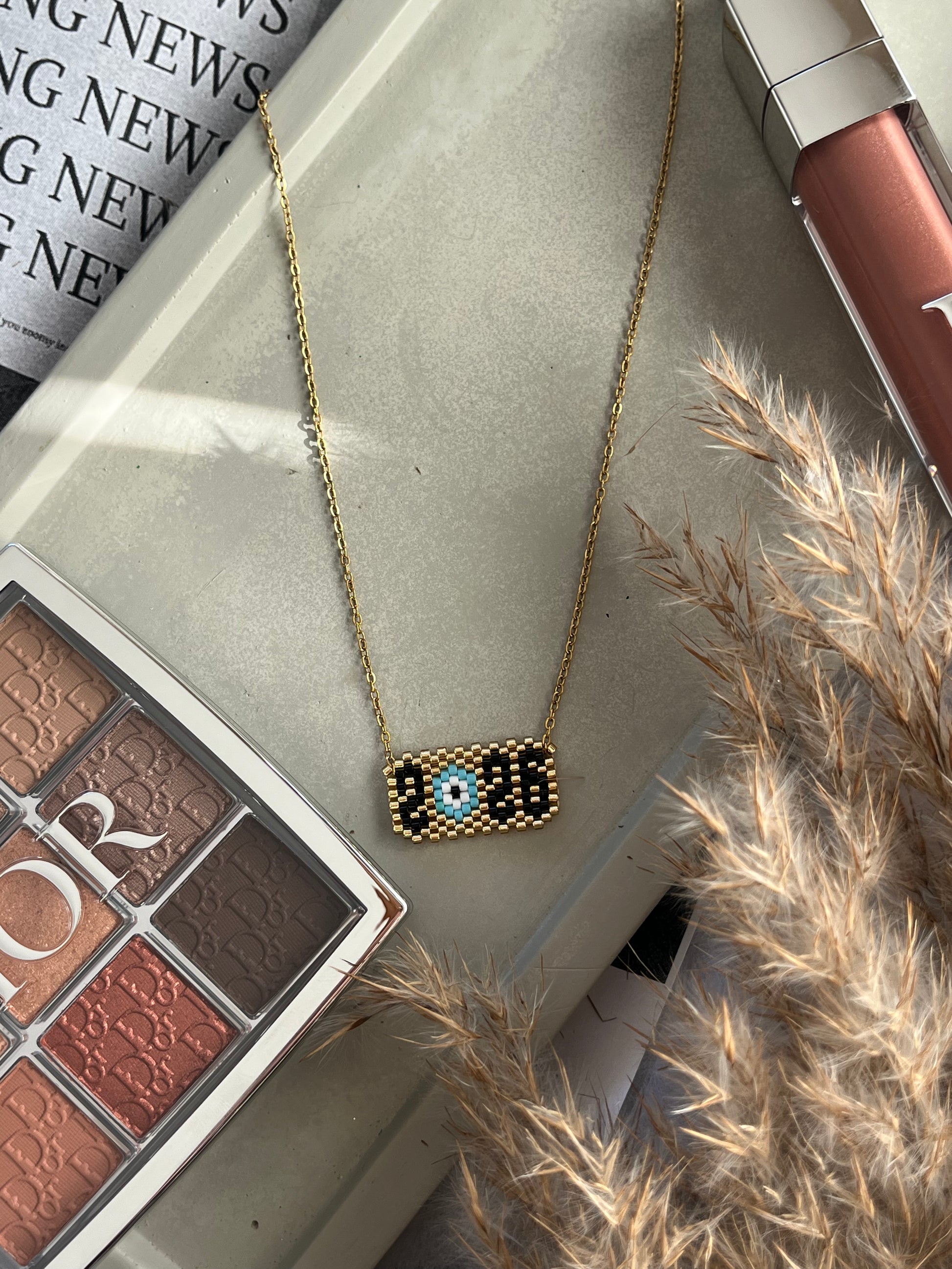 Ένα κολιέ που συνδυάζει το αγαπημένο σου κεντητό στοιχειό με το ματάκι και έρχεται να σε συνοδέψει στη νέα χρονιά.Ιδανικό για να φορεθεί μόνο του ή σε συνδυασμό με άλλα κολιέ από το πρωί μέχρι το βράδυ.