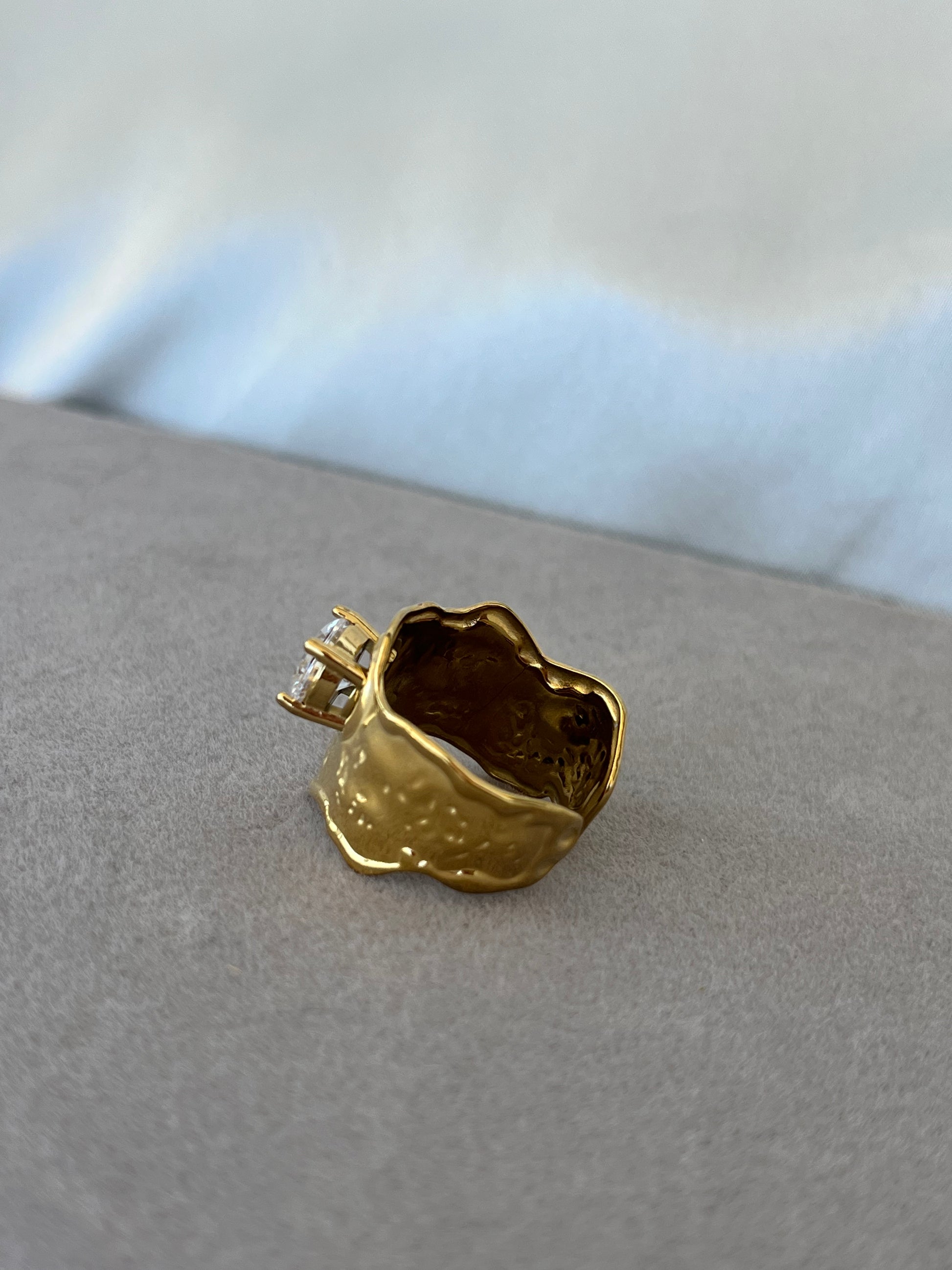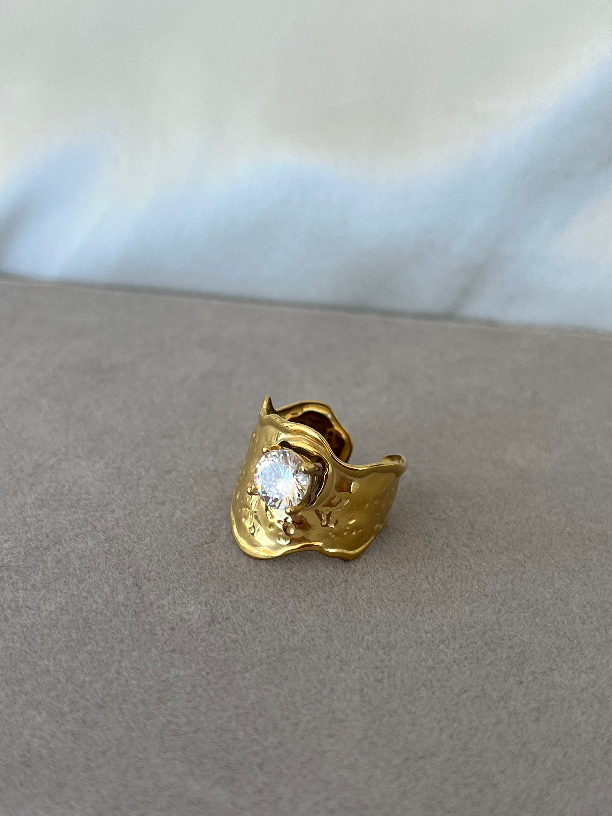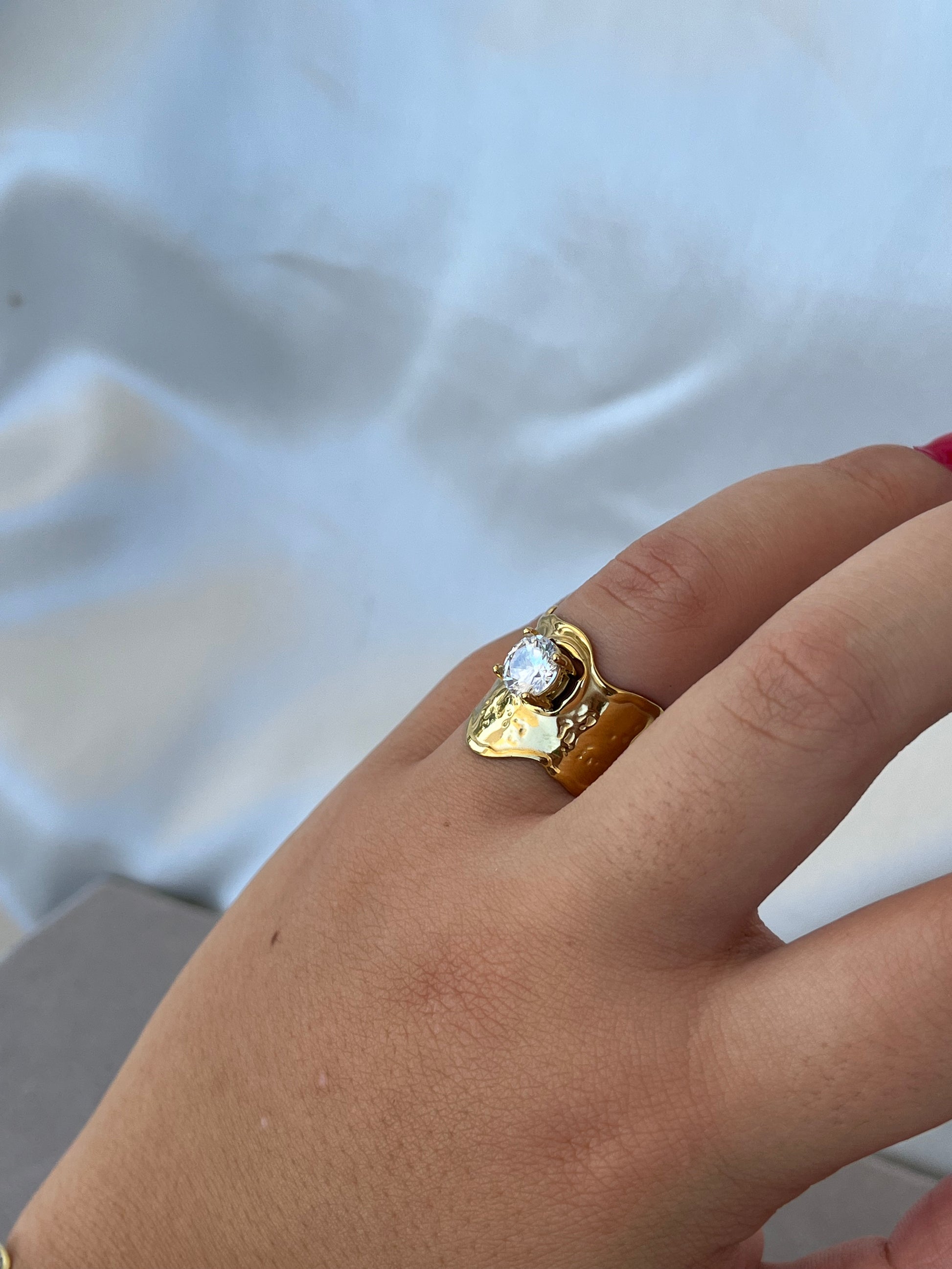 Γυναικείο δαχτυλίδι με δυνατότητα αυξομείωσης από ανοξείδωτο ατσάλι και πέτρα ζιργκόν πάνω σε ανάγλυφη υφή τύπου σκαλιστό.