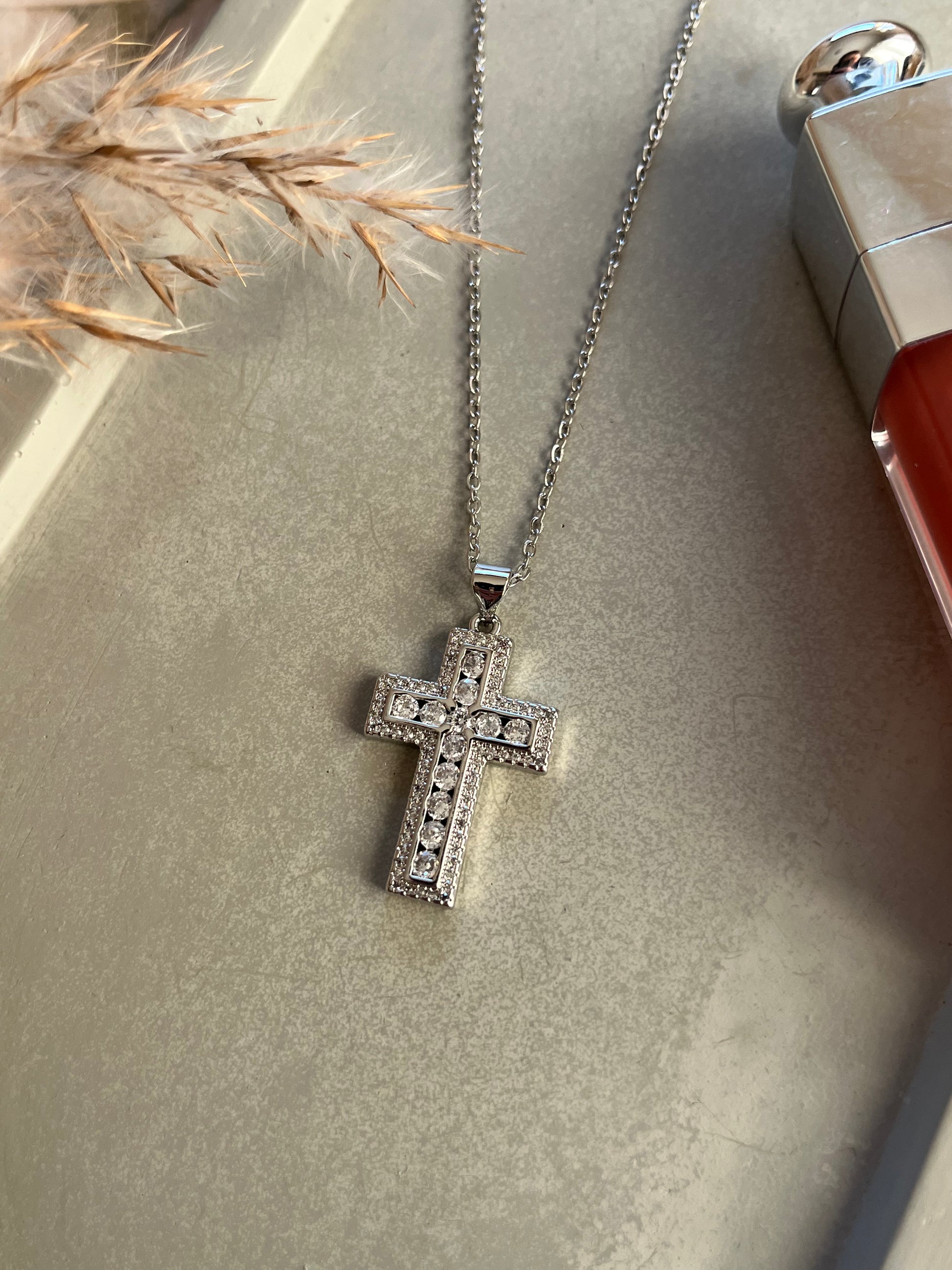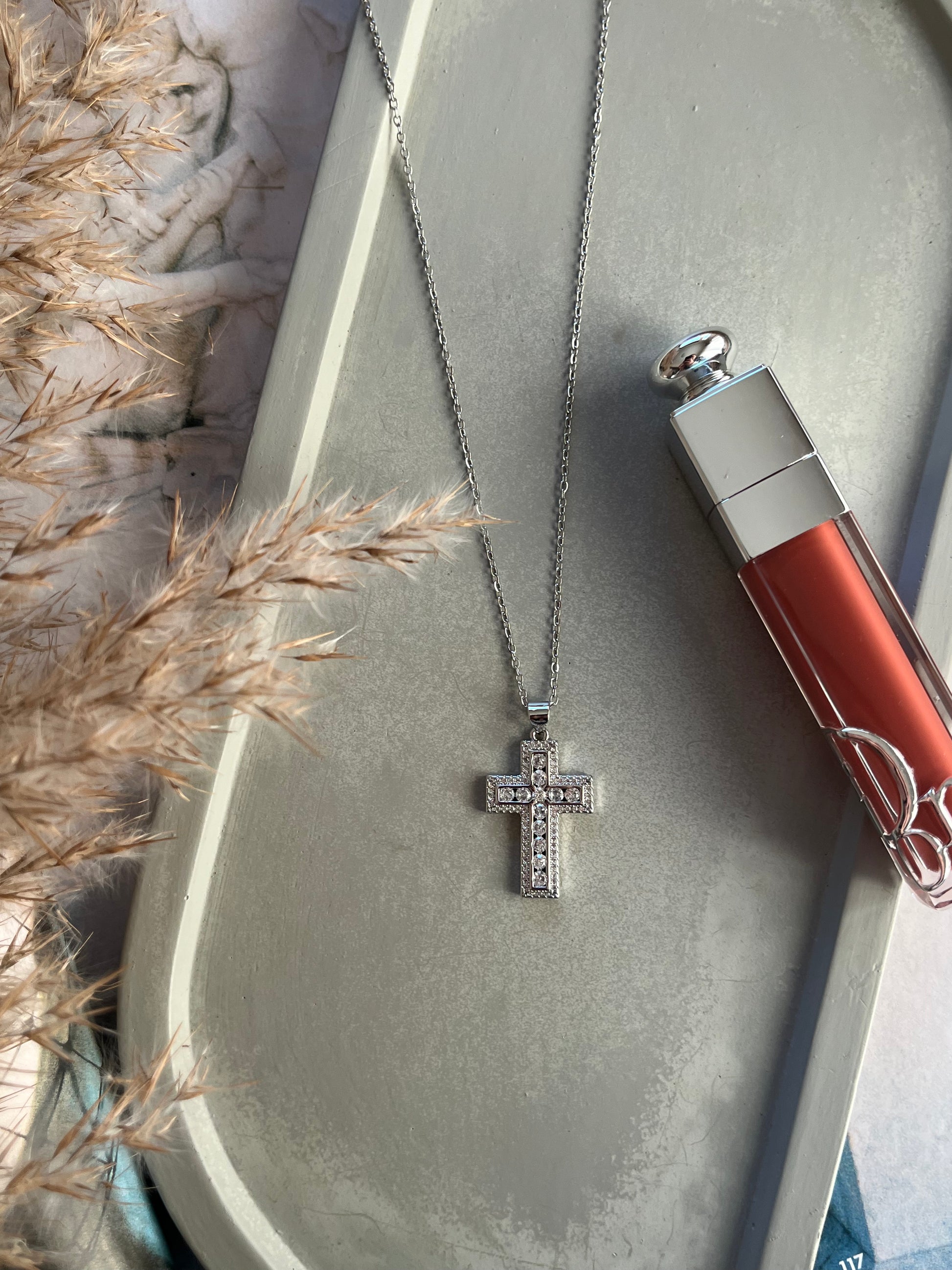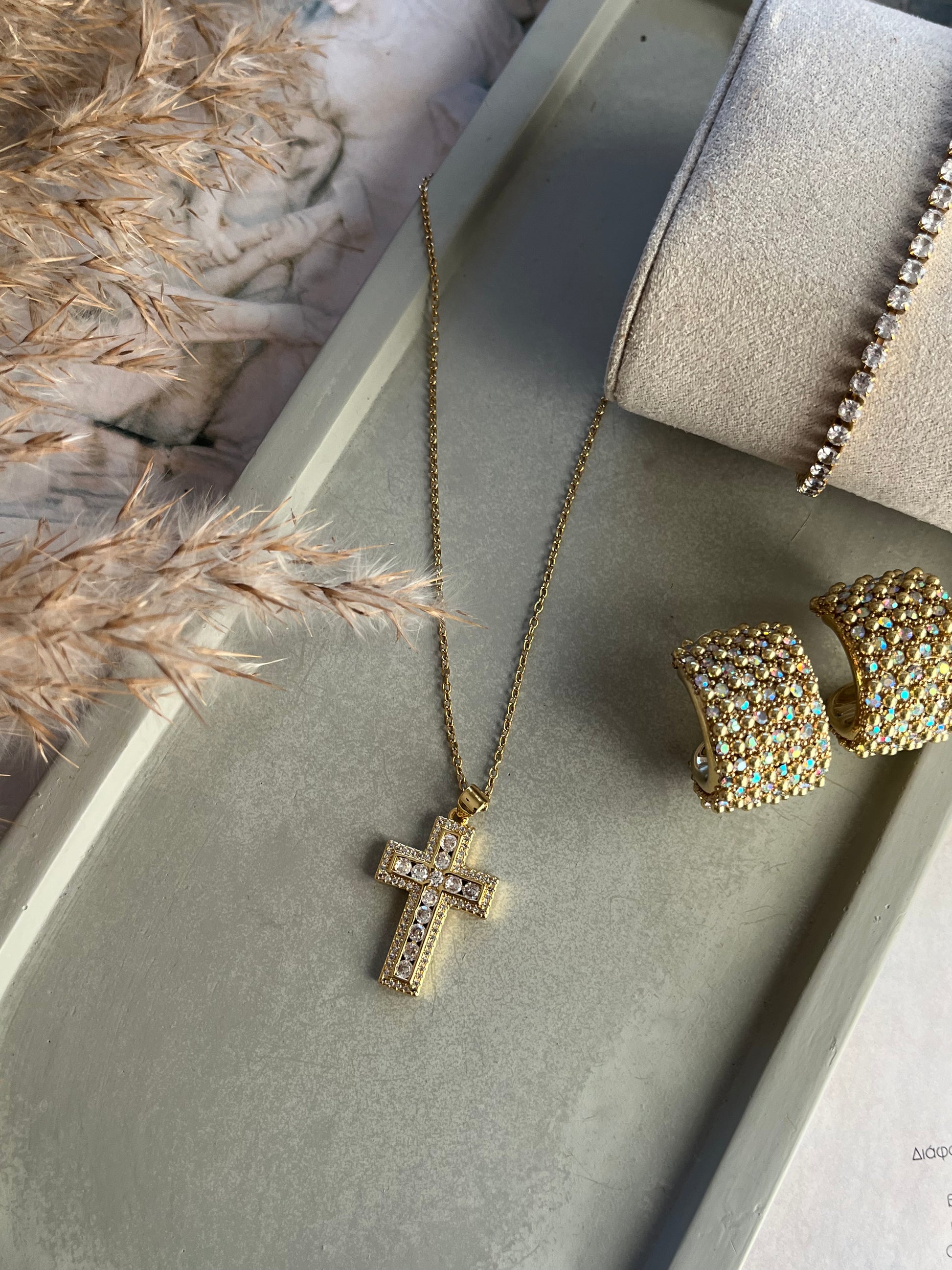 Γυναικείο κολιέ σταυρός μεσαίου μεγέθους με αλυσίδα και ζιργκόν από ανοξείδωτο ατσάλι.