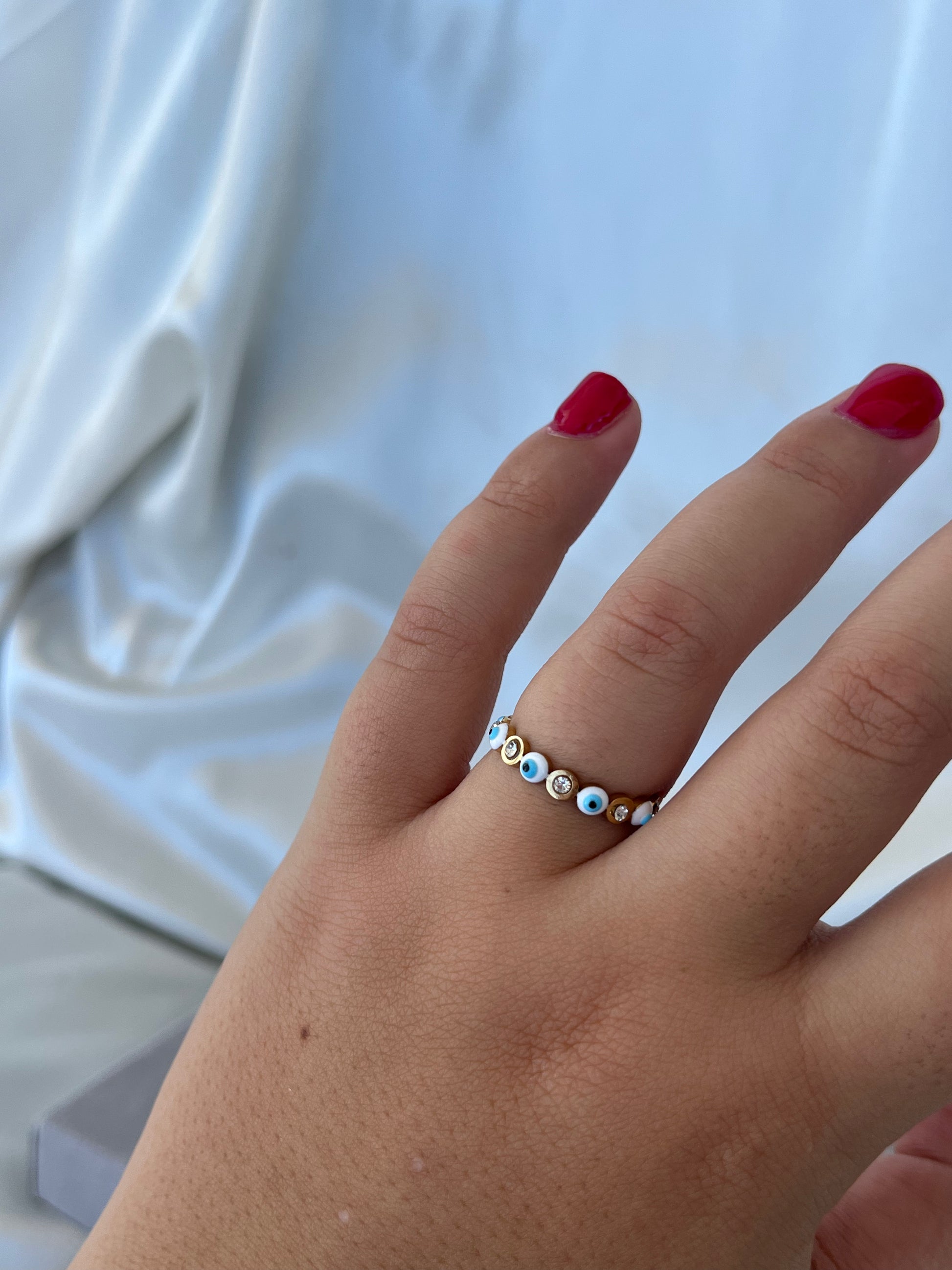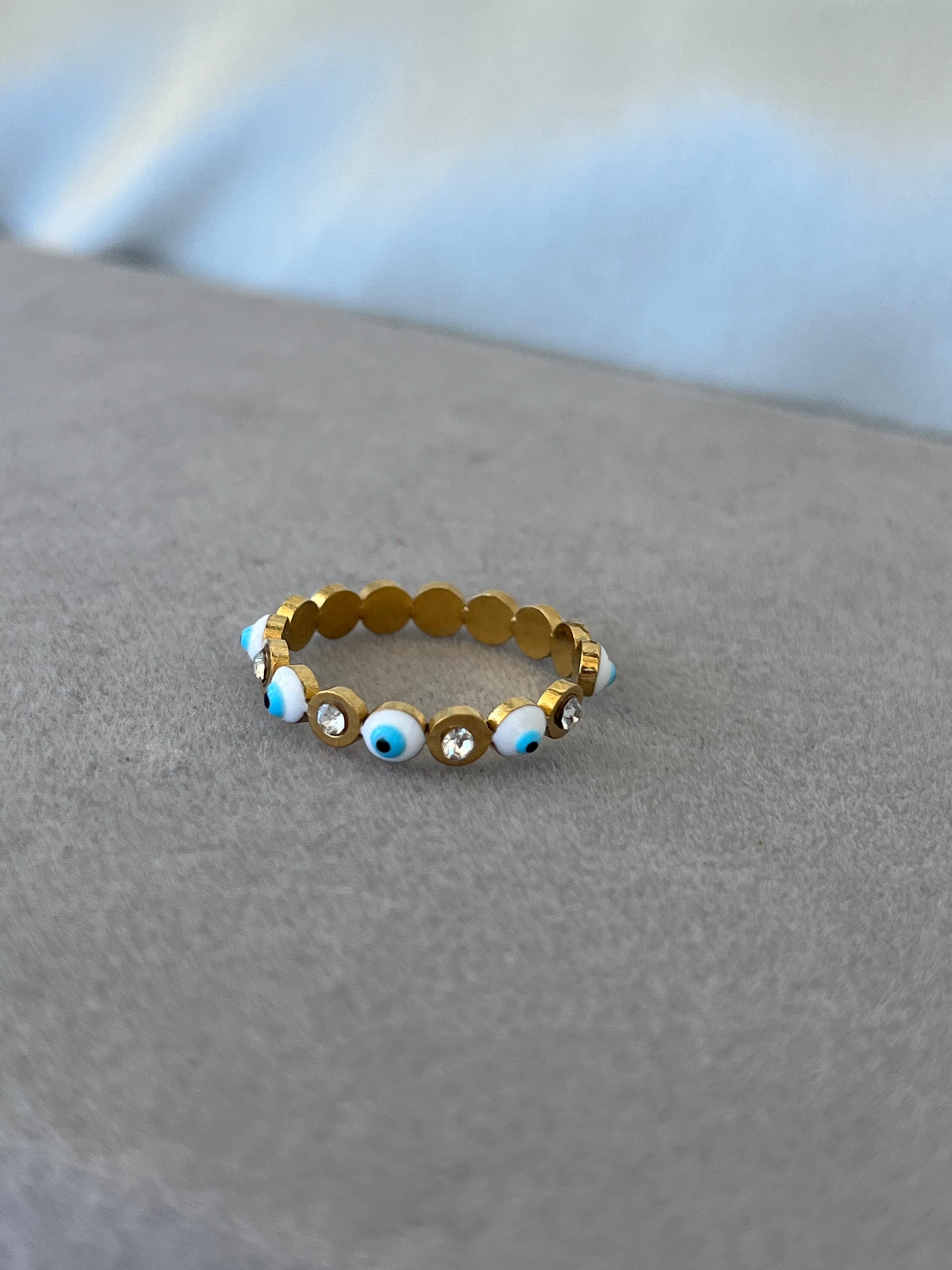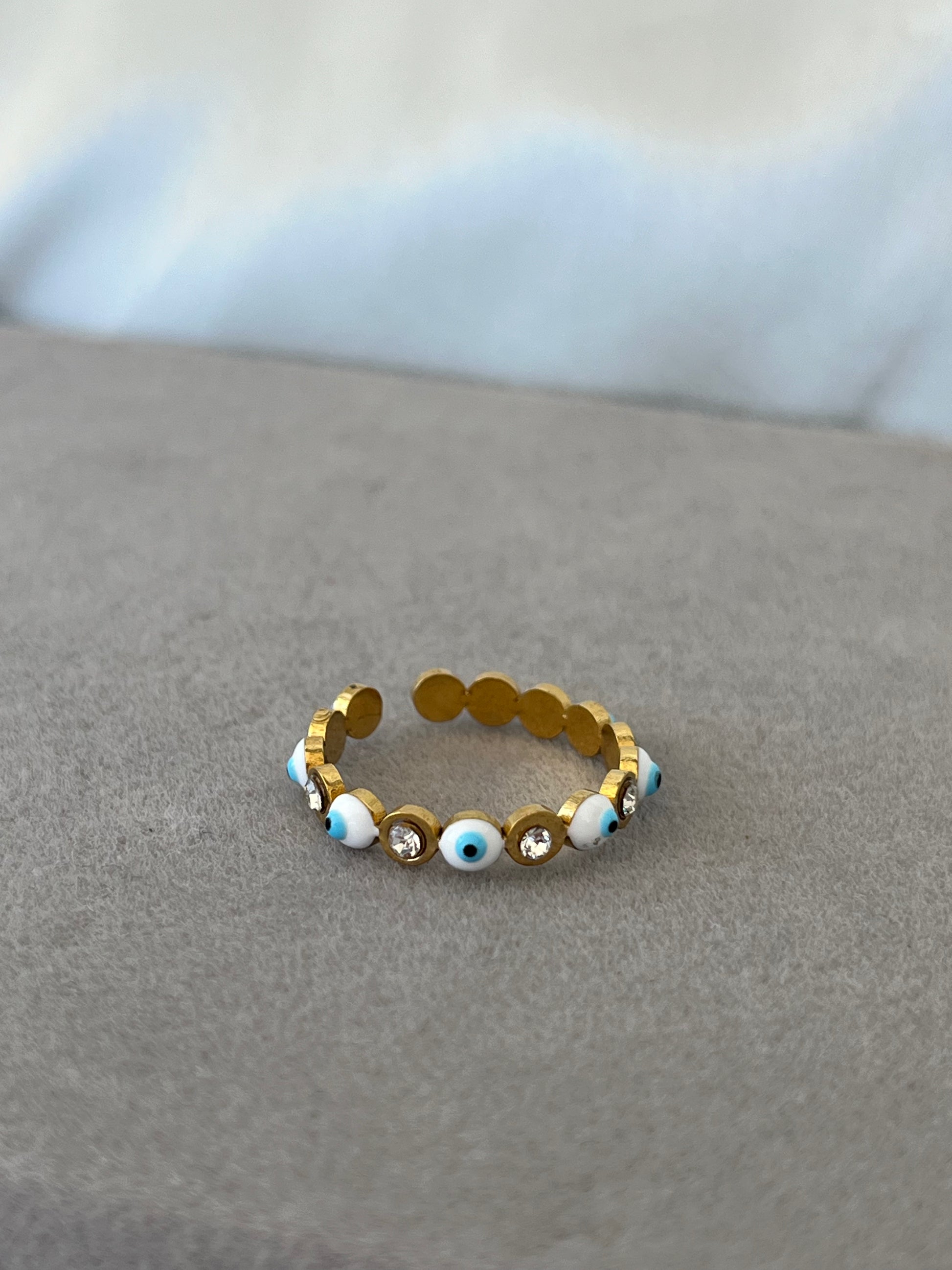 Γυναικείο δαχτυλίδι με ματάκια και ζιργκόν με δυνατότητα προσαρμογής σε όλα τα μεγέθη, από ανοξείδωτο ατσάλι.