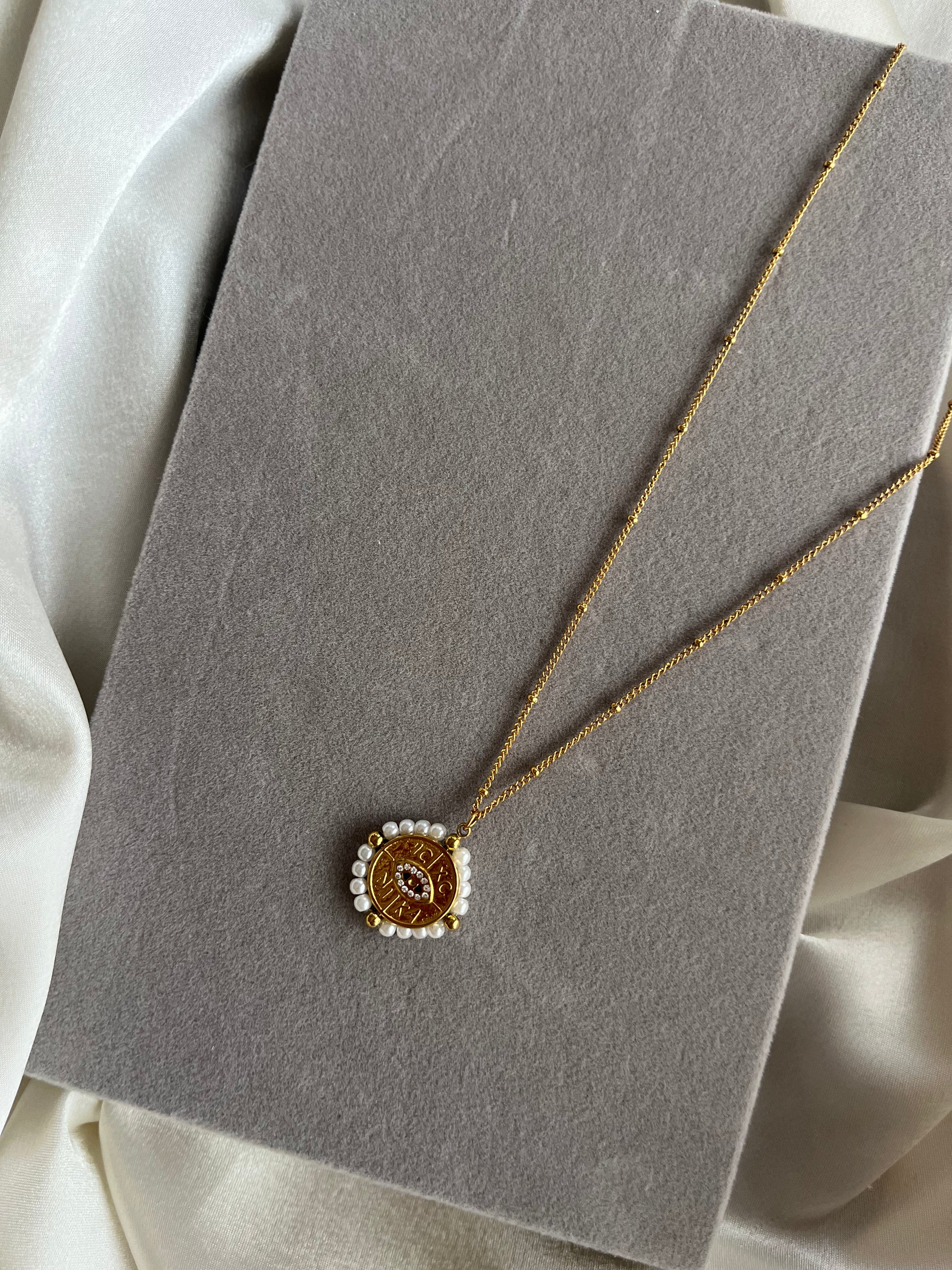 Γυναικείο κολιέ με αλυσίδα που έχει κατά μήκος της μπίλιες, με σύμβολο κωσταντινάτο που έχει πέρλες τριγύρω του και ματάκι στο εσωτερικό με ζιργκόν.