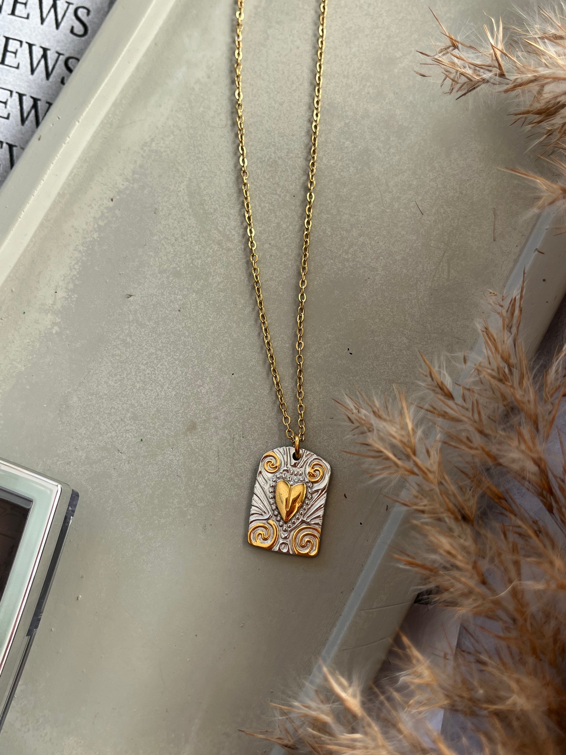 Γυναικείο κολιέ από ανοξείδωτο ατσάλι με σχέδιο ανάγλυφης καρδιάς σε μίξη χρυσού-ασημί.Ιδανικό κολιέ για layering,διατηρώντας το ρομαντικό και πιο σύγχρονο στοιχείο χάρις την μίξη μετάλλων του.