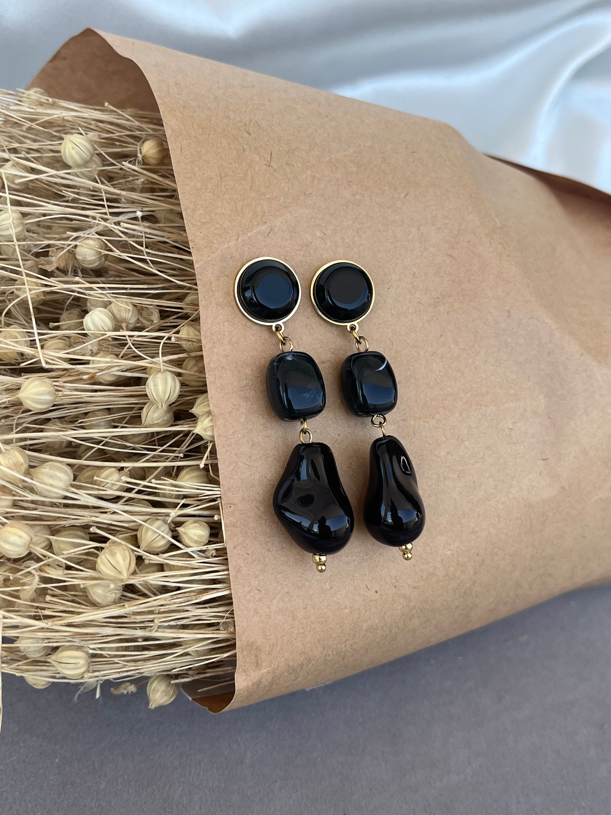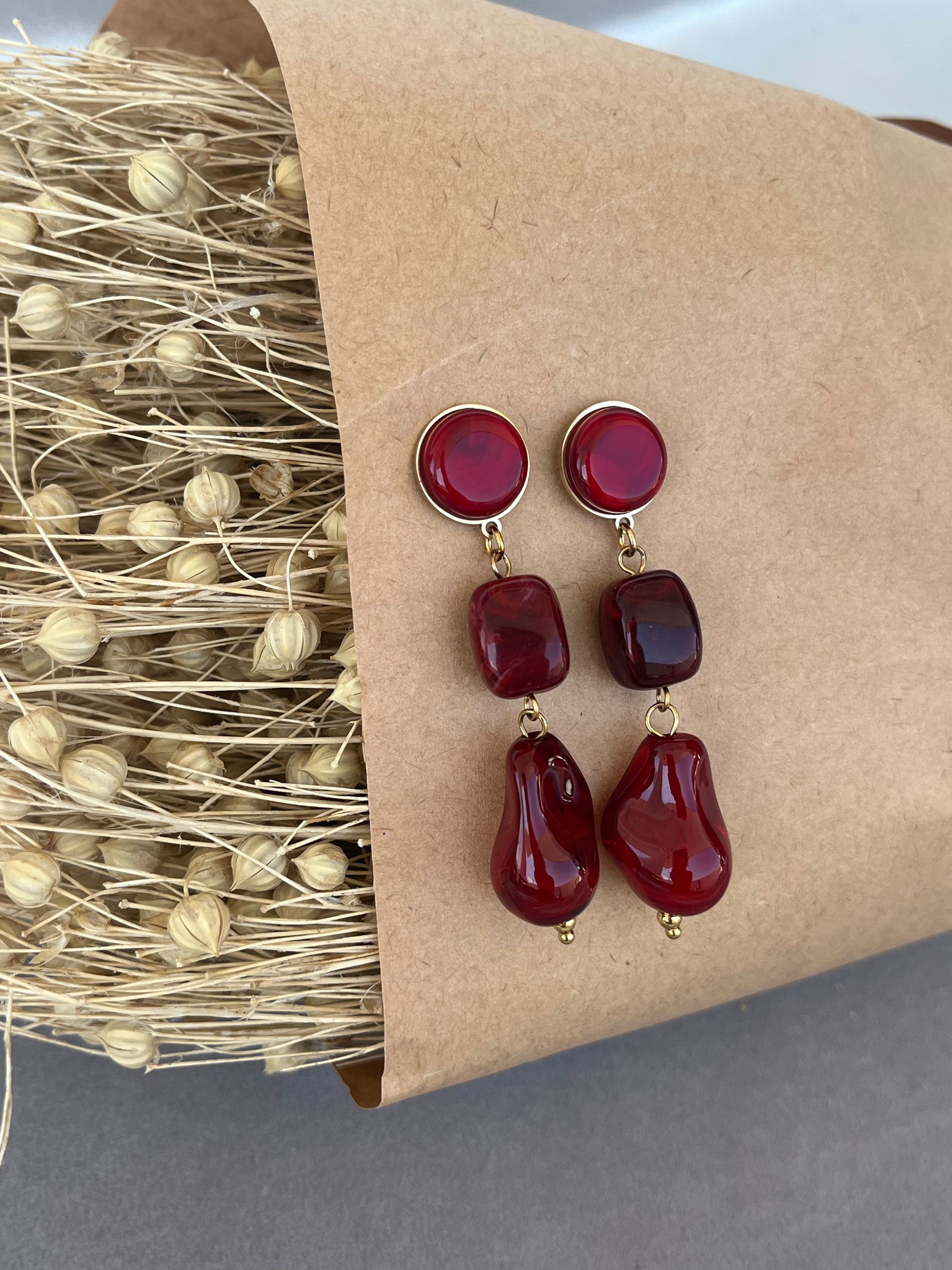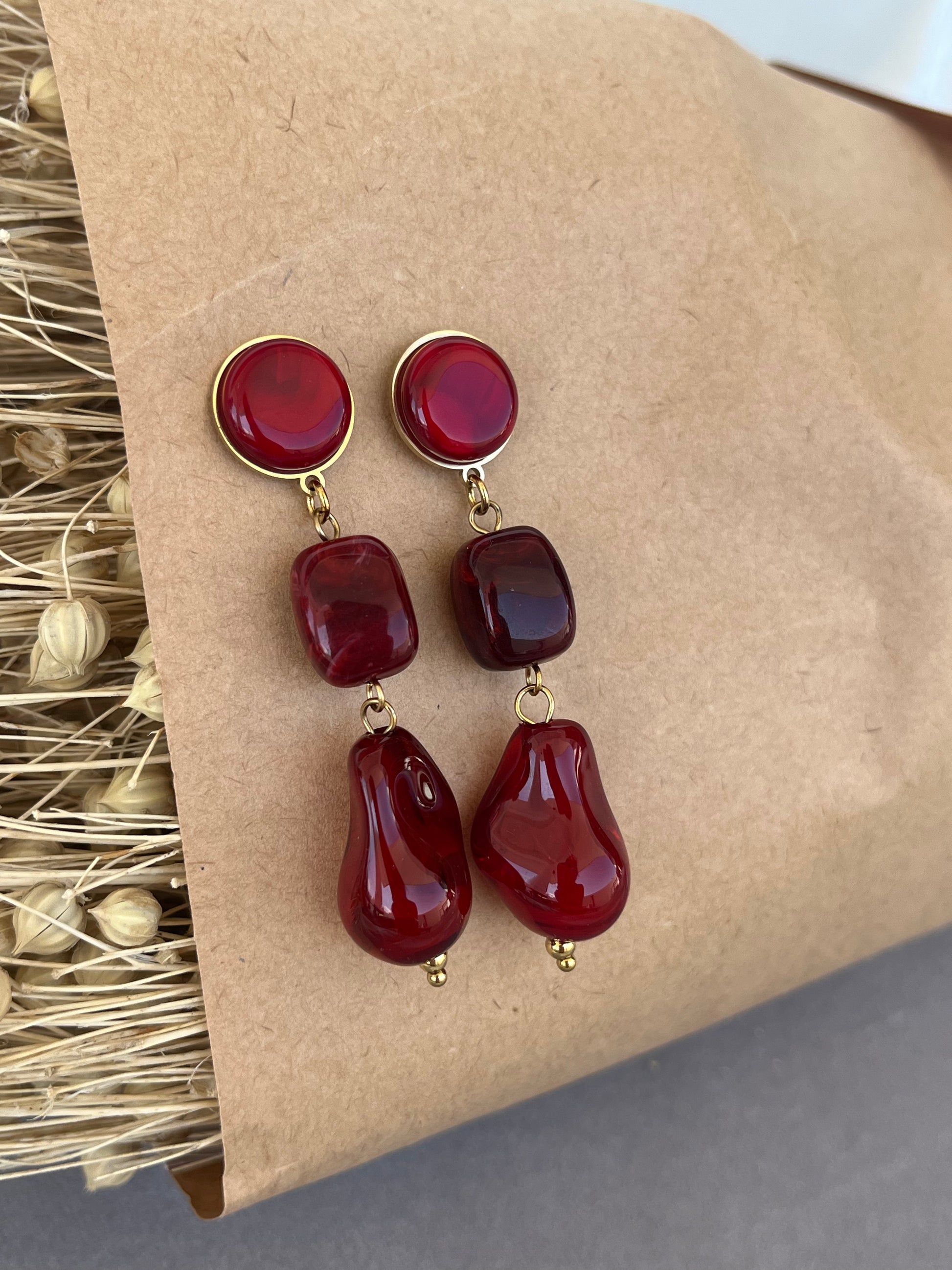 Γυναικεία σκουλαρίκια με κρεμαστές κοκκάλινες πέτρες και χρυσές λεπρομέρειες από ανοξείδωτο ατσάλι.
