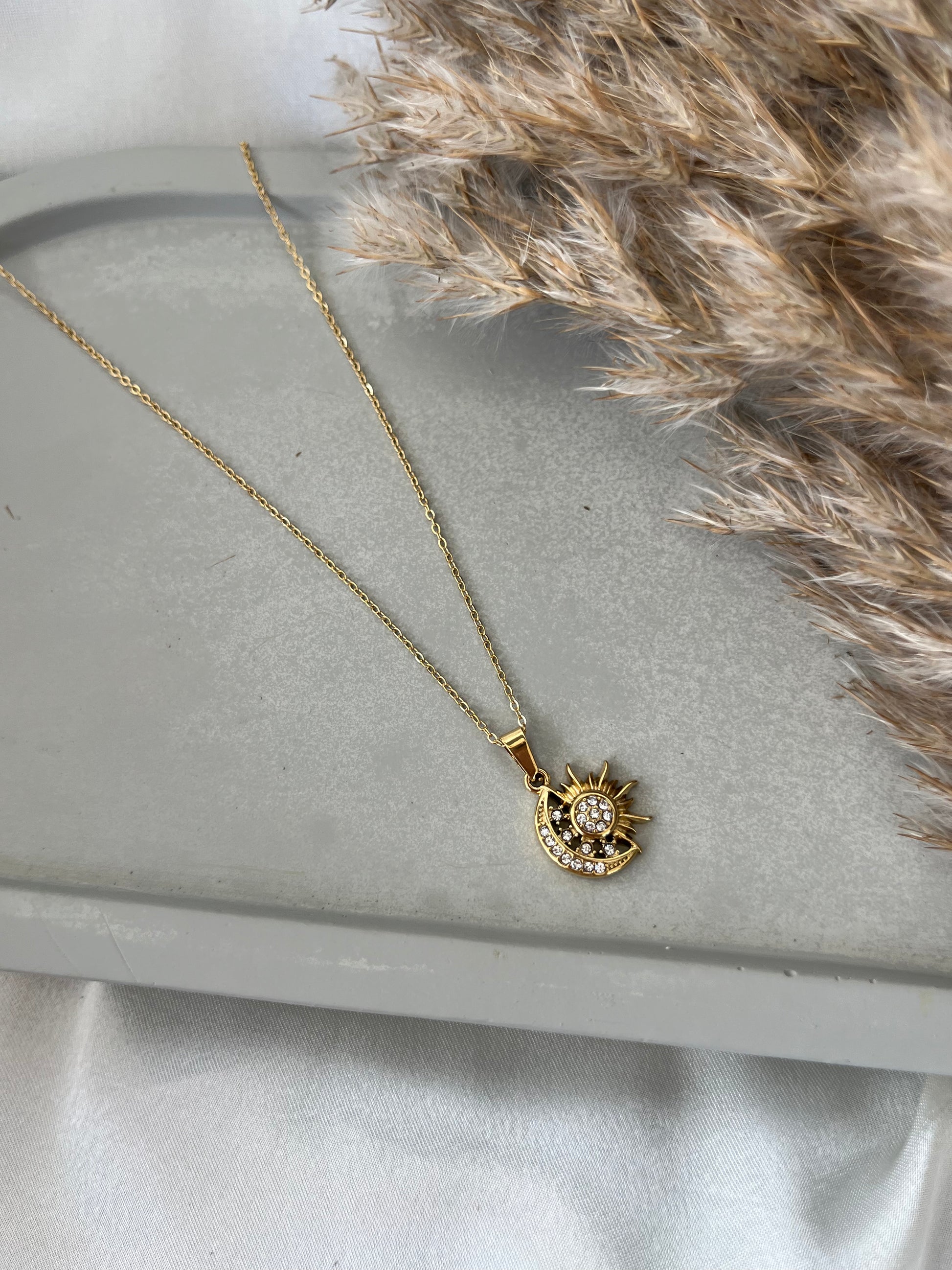 Γυναικείο κολιέ με λεπτή αλυσίδα και σχέδιο ήλιος-φεγγάρι διακοσμημένο με ζιργκόν από ανοξείδωτο ατσάλι.